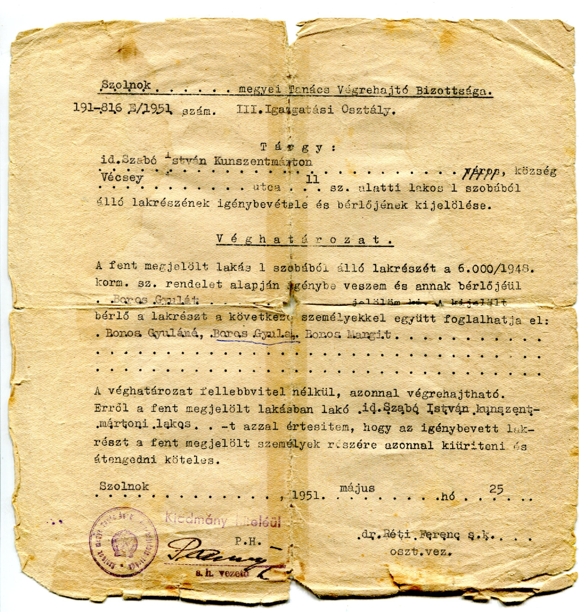 A pártapparátus és az őket kiszolgáló csoportok tagjai így jutottak lakásokhoz. A hivatkozási alap a 8130/1939. ME és a 760/1939. BM rendelet volt. A lakások elkobzásáról pedig a 6000/1948. számú minisztertanácsi rendelet döntött. Az eljárás egyike volt a Rákosi-rendszer kegyetlen, jogtalan és törvénytelen eljárásainak.