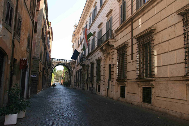 A Via Giulia Rómában, jobbra a Pápai Magyar Intézet épülete (forrás: User: /WT-shared/ Roundtheworld at wts wikivoyage, Public domain/Wikimedia Commons)