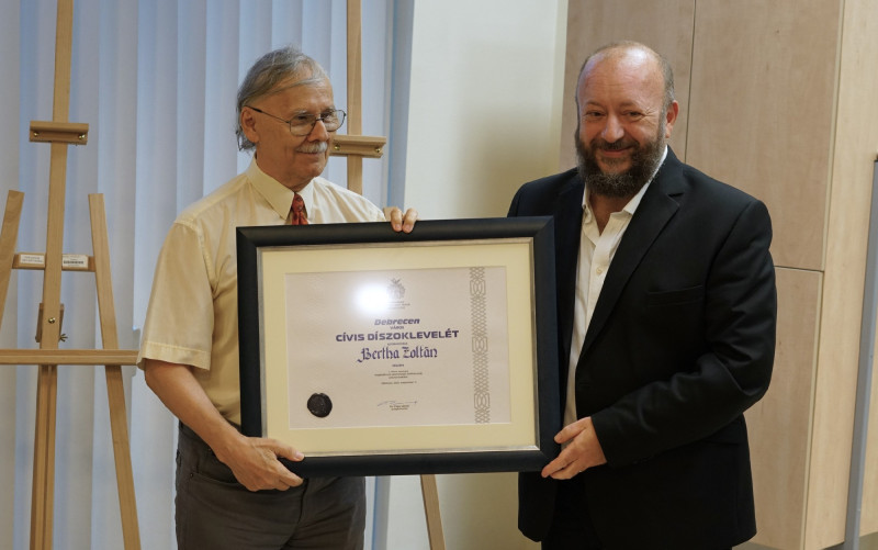 Debrecen város cívis díszoklevelét Puskás István, Debrecen kulturális ügyeiért felelős alpolgármestere adta át Bertha Zoltánnak