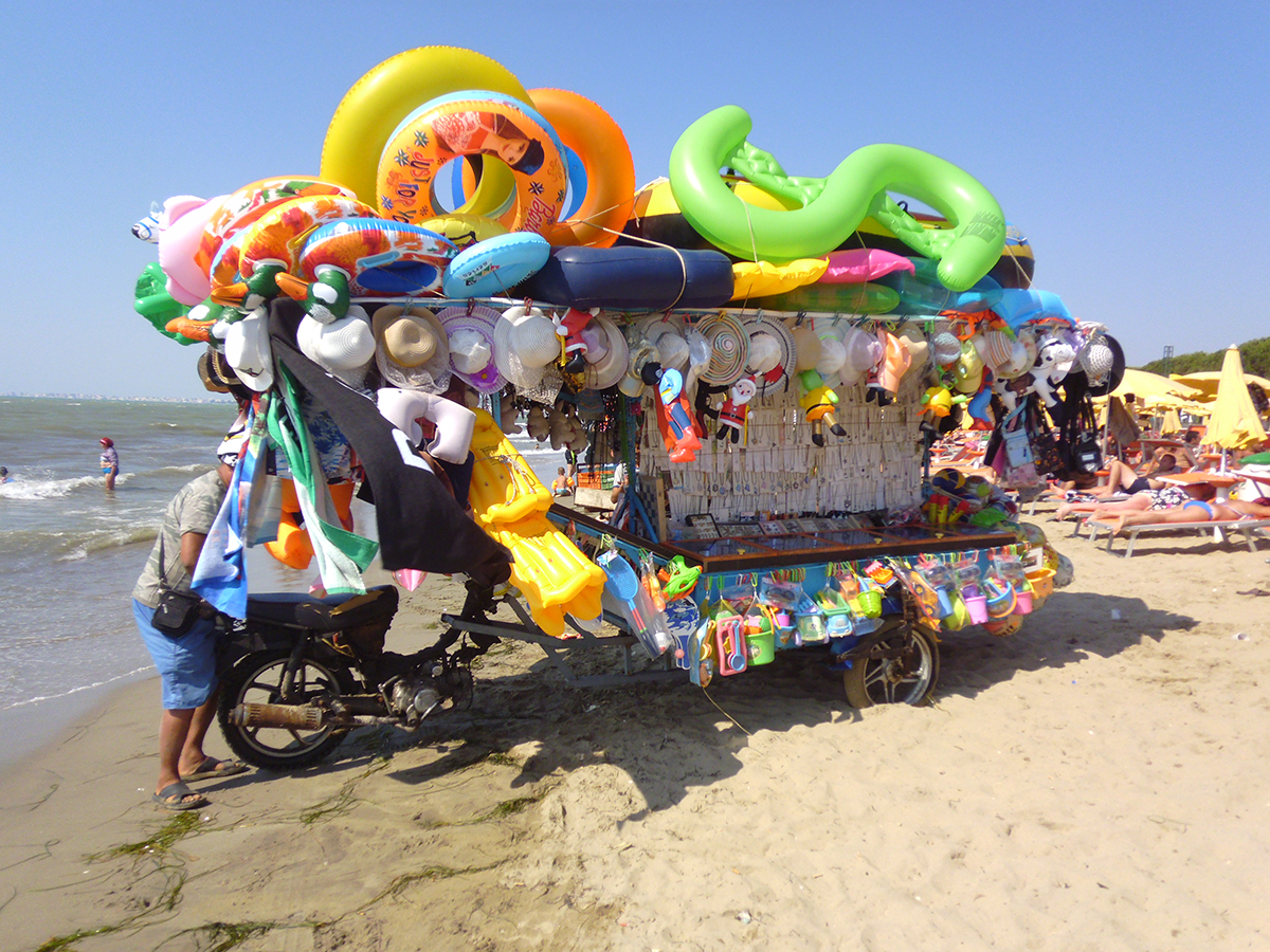 A strandcikkeket kínáló mozgóárus rozsdás, háromkerekű motorja mögé bújt a kamera elől