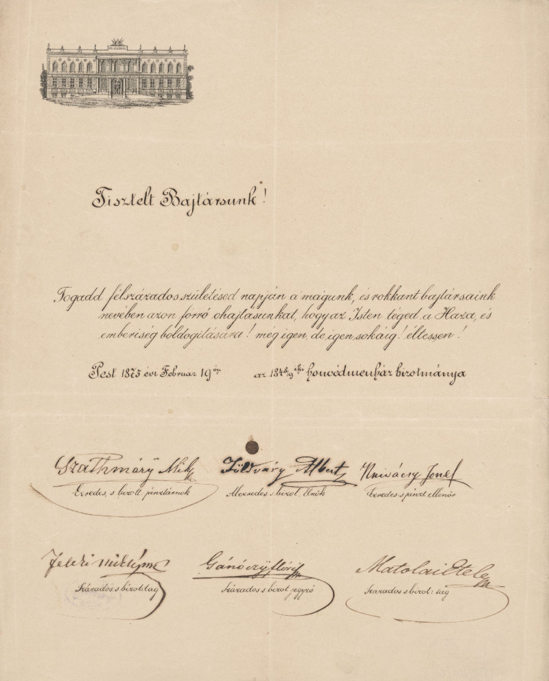 Az 1848/9iki Honvédmenház Bizottmánya köszönőlevele Jókai Mórnak. Budapest, 1875. febr. 19.
