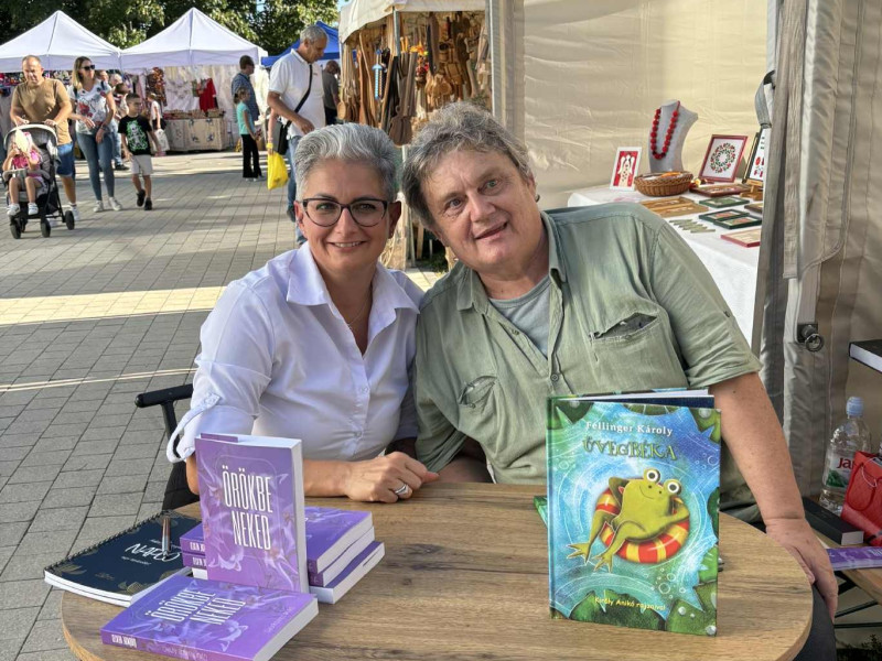 A 2025-ös Csallóközi Vásáron, Dunaszerdahelyen Gyurkovics Anikó íróval, az Üvegbéka gyerekverskötet dedikálásakor