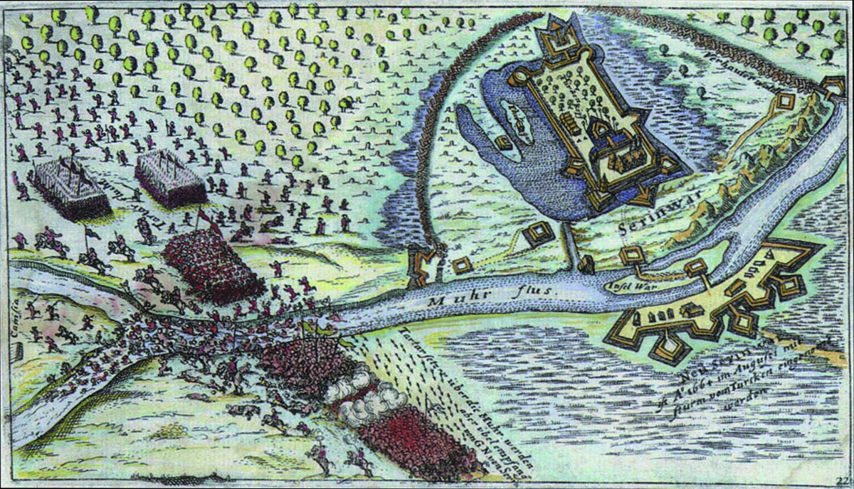az erődítményt, melyet a költő 1661-ben saját költségén kezdett építtetni a védelmi vonal megerősítésére. Felépítésére a szerencsétlenül alakuló erdélyi események szolgáltattak okot. II. Rákóczi György balul végződő lengyelországi hadjáratát követően Köprülü Mehmed nagyvezér tatár hadak kíséretében Erdélyre támadt (1658), feldúlta az országot, majd Barcsai Ákost ültette a fejedelmi székbe. Rákóczi György 1659-es visszatérését újabb tatár és török támadás követte, melynek során 1660-ban török kézre került a stratégiai fontosságú Várad is. Az esemény nagy felháborodást keltett Magyarországon, a király végre kénytelen volt Erdélybe segítséget küldeni. Montecuccoli 1661-es hadjárata azonban eredménytelenül végződött, Kemény János megsegítése helyett zsoldosai a lakosságot fosztogatták. Ráadásul a beavatkozás miatt most már magyarországi török támadástól is tartani kellett. Erre Köprülü Ahmed vezetésével 1663-ban került sor. A királyi hadvezetést meglepte a török felvonulás iránya: szinte tétlenül nézte Érsekújvár elfoglalását. Csak Zrínyi ért el sikereket téli hadjáratával (melyben a törökellenes Rajnai Liga katonái is részt vettek már), s melynek legdicsőbb tette a török utánpótlási vonalat biztosító eszéki Dráva-híd felégetése volt 1664 februárjában (6. kép). Ezt követően Kanizsa ostromát is megkísérelte, de a „meglepetés” az engedély késlekedése, a hiányos felszerelés, a parancsnokok nézeteltérései s a várvédők szívós ellenállása miatt elmaradt: a török segédcsapatok megérkezésének veszélye miatt az ostromot abba kellett hagyni. Most már Zrínyi-Újvár került szorongatott helyzetbe. Az új fővezér, Montecuccoli kénytelen volt a várat föladni, melyet a törökök elfoglaltak és földig romboltak. Zrínyi mindezt saját kudarcaként élte meg. Amilyen jól indult számára az 1664-es év, olyan rosszul folytatódott. (S még nem is volt vége.)