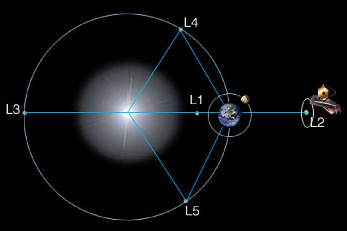 Míg a Hubble a Föld körül kering, nagyjából 600 kilométer magasságban, a Webb-űrtávcsövet a Nap–Föld-rendszer úgynevezett L2 Lagrange-pontjába küldte a NASA. Az égi mechanika egyik legfontosabb problémája a korlátozott háromtestprobléma, amely azzal foglalkozik, hogy két nagy tömegű égitest gravitációs terében hogyan mozog egy harmadik, hozzájuk képest elhanyagolható tömegű test. Ebben a konfigurációban létezik öt olyan pont – ezek a Lagrange-pontok –, ahol a kis tömegű test a két nagyhoz képest hosszú ideig többé-kevésbé nyugalomban maradhat. Három Lagrange-pont a nagy égitesteket összekötő egyenesen helyezkedik el, az L1 közöttük, az L2 a kisebb tömegűnek a nagyobbikkal átellenes oldalán, az L3 pedig fordítva, míg az L4 és az L5 pontok egyenlő szárú háromszöget alkotnak a nagy égitestekkel. A Nap–Föld-rendszer esetében az L2 pont tehát a Nappal átellenes oldalon, a Földtől mintegy másfél millió kilométerre van. Az L2 pont „értékét” az adja, hogy az ideirányított űrtávcsövekkel – nem a Webb az egyetlen – részben a jó láthatóság, részben a még viszonylag kis távolság miatt könnyű a kommunikáció, a pálya stabilitása pedig kevés üzemanyag felhasználásával fenntartható. A megoldásban van egy kis trükk is: a Webb valójában nem az L2-ben van, hanem kering körülötte, mégpedig olyan ellipszispályán (vagy halópályán), amelynek a mérete (pontosabban a nagytengelye) nagyjából akkora, mint a Föld–Hold-távolság.