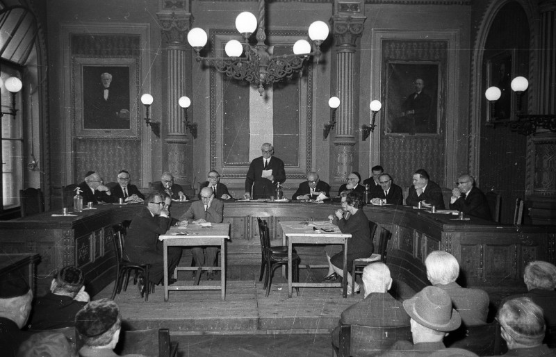 Ülésezik a Magyar Izraeliták Országos Képviselete (később a Magyarországi Zsidó Hitközségek Szövetsége) a Síp utcai székház dísztermében 1968. május 26-án; Seifert Géza elnök beszédét tartja, tőle balra Benoschofsky Imre főrabbi, jobbra kettővel Schuck Jenő ortodox főrabbi, majd Scheiber Sándor és Salgó László főrabbi (fotó: Bauer Sándor, Fortepan)