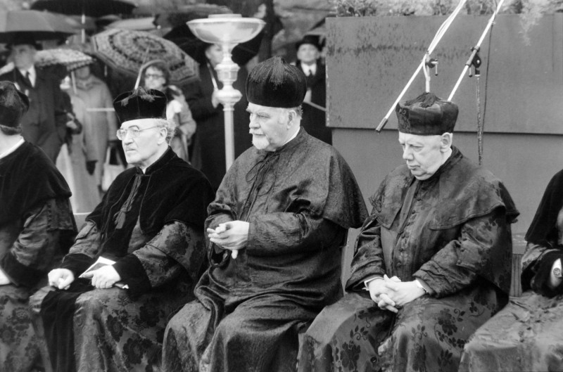 Gyászistentisztelet a Kozma utcai izraelita temetőben a magyar zsidóság deportálásának negyvenedik évfordulóján, 1984. május 13-án, balra Scheiber Sándor, középen Salgó László főrabbi (fotó: Gábor Viktor, Fortepan)