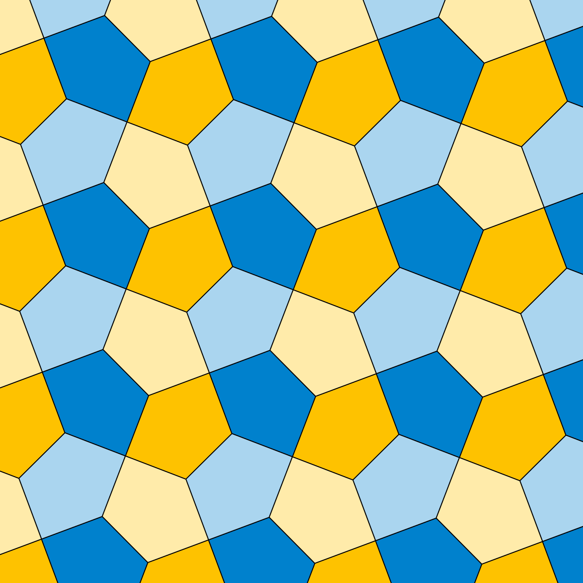 Vegyünk ezek közül még egyet, amely kairói csempe névvel került be a matematikai köztudatba. A nevét a Kairóban lefényképezett, kétes tisztaságú járdáról kapta. „Gyönyörű!” – kiáltott fel elragadtatással az ilyesmivel (is) foglalkozó matematikus, amikor a képet meglátta. Többünknek alighanem a jobb oldali rajz nyeri meg inkább a tetszését. Rajta tisztábban szemlélhető a geometria sokszínűsége. Bár a színek megválasztása azt sugallja, hogy az ötszögek kiemelkedhetnek a síkból, de igazolható, hogy ez nem így van. Itt az eltolásokat vezérlő klaszter négy, különböző színű ötszögből álló, úgynevezett affin szabályos hatszög, amelynek a szemközti oldalai párhuzamosak és egyenlők.